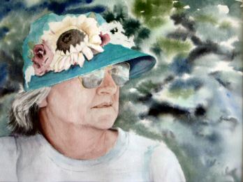 Watercolor portrait of Alayna with flowers.